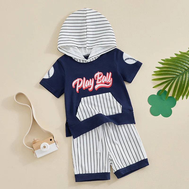 Hit a home run with this delightful toddler boy's baseball-themed set, ideal for the little slugger in your life. The set includes a hooded tee featuring a "Play Ball" graphic and stylish pinstriped accents, paired with matching shorts that are perfect for both playtime and casual outings. The lightweight material offers comfort and flexibility, allowing for a full range of motion as your little one enjoys his day. This adorable ensemble is sure to be a favorite in any young sports enthusiast's wardrobe, embodying the spirit of the game and the joy of childhood.