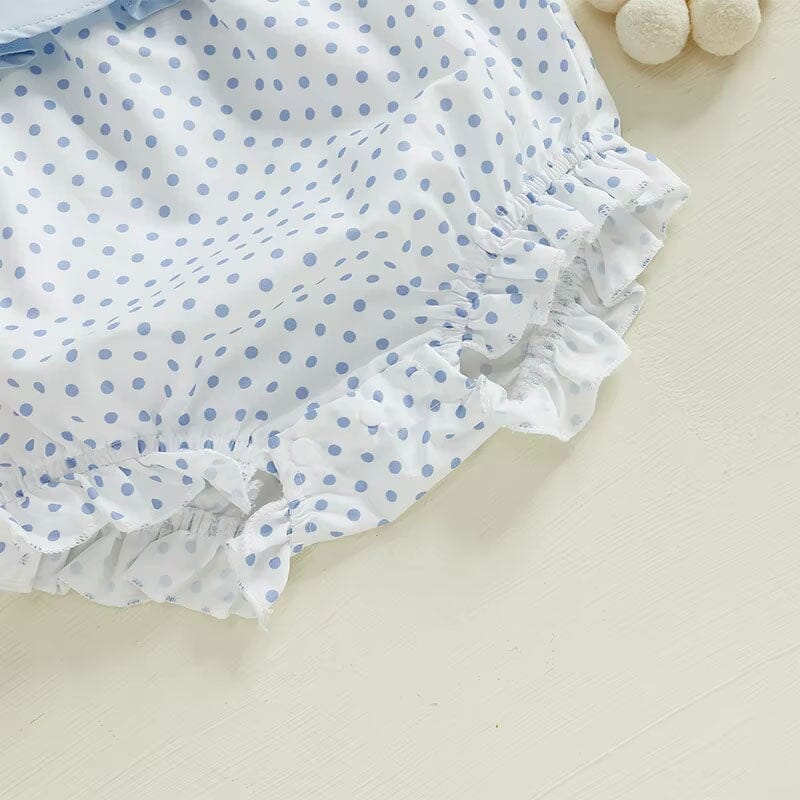 Celebrate Easter in style with this delightful baby girl romper, perfect for the season's festivities. Featuring an adorable polka dot pattern and a charming ruffled neckline with embroidered bunny accents, this romper is both sweet and playful. Make your baby girl’s Easter extra special with this enchanting outfit that combines cuteness and practicality!