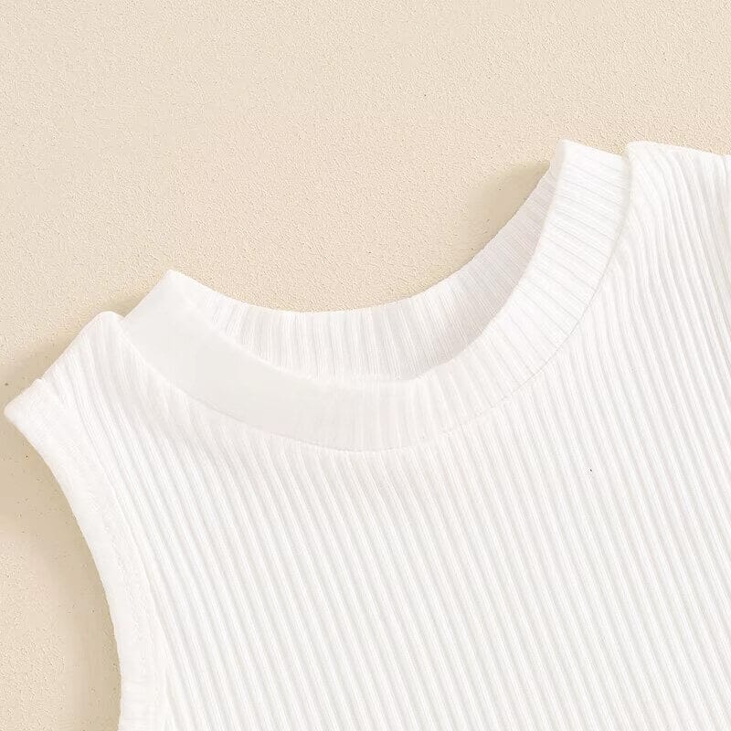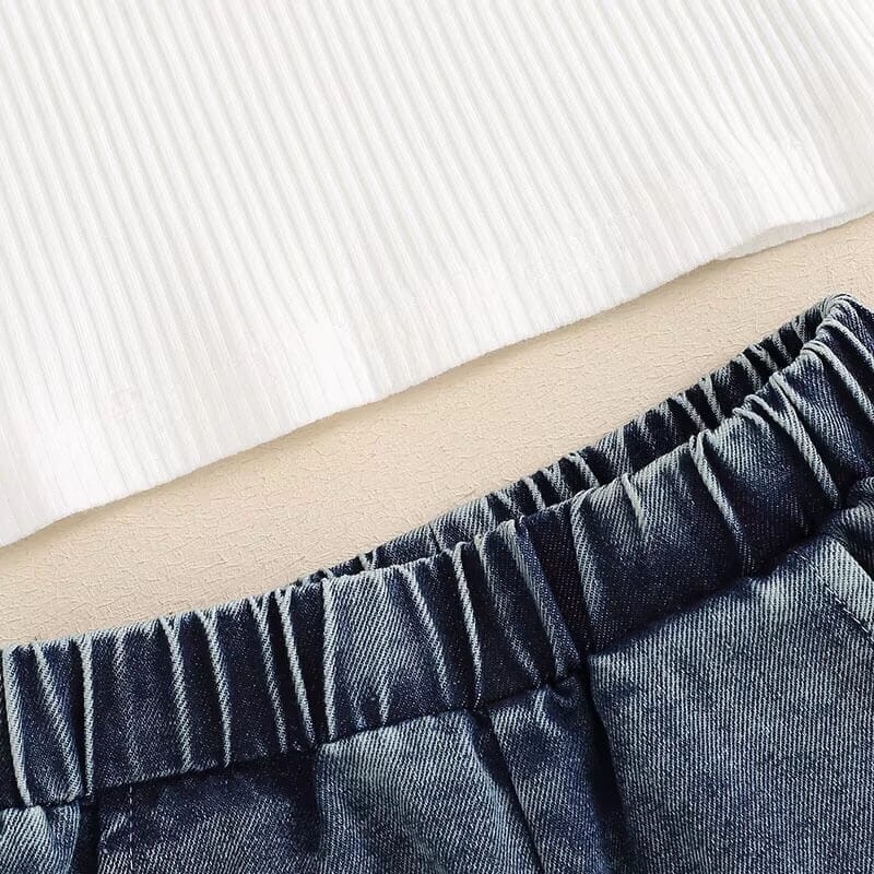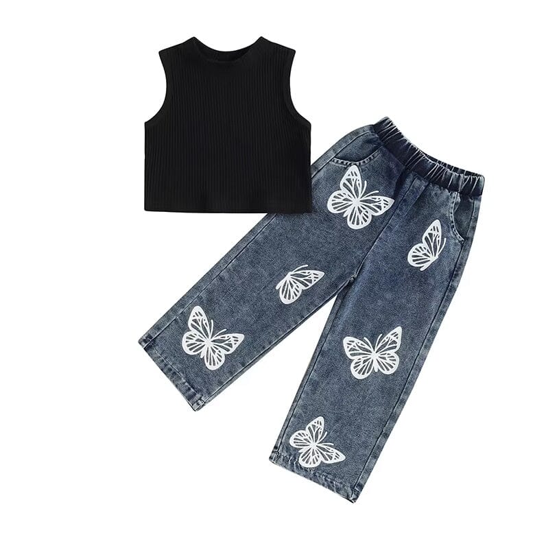 This versatile toddler girl set offers two stylish tank tops—one in classic white and the other in bold black - paired with charming denim jeans adorned with white floral and butterfly appliqués. The soft, stretchable tank tops ensure comfort throughout the day, making them ideal for active little ones. The jeans feature a comfortable elastic waistband and a playful design that brings a dash of whimsy to everyday wear. Perfect for a sunny day out or a casual gathering, this set is designed to keep your little fashionista both comfortable and stylish.