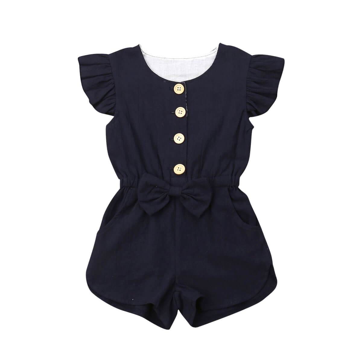 This darling toddler girl romper is perfect for any occasion, with its adorable ruffle sleeves and bow detailing that add a touch of femininity. The lightweight fabric ensures your little one stays cool and comfortable all day long. With its fun and playful design, this romper is sure to become a staple in your little girl's wardrobe!