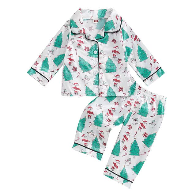 This adorable unisex toddler pajama set is covered in a fun and festive Christmas tree, Santa and snowman print, making it the perfect choice for the holiday season. The set features a cozy, button-up top and matching elastic waist pants, both crafted from soft, satin-like fabric to keep your little one warm and comfortable all night long. Ideal for Christmas Eve, holiday gatherings, or seasonal family photos, these pajamas add a touch of holiday cheer to your toddler’s sleepwear.