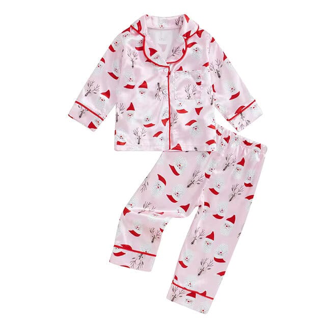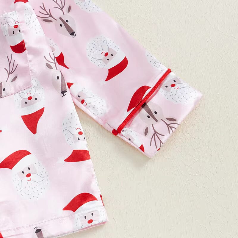 This delightful unisex toddler pajama set is adorned with a whimsical Santa Claus print, making it a festive choice for Christmas. The set includes a comfortable button-up top and matching pants, both made from a soft and breathable fabric that ensures your little one's comfort throughout the night. Perfect for Christmas Eve or morning unwrapping presents, these pajamas are also great for seasonal family photos.