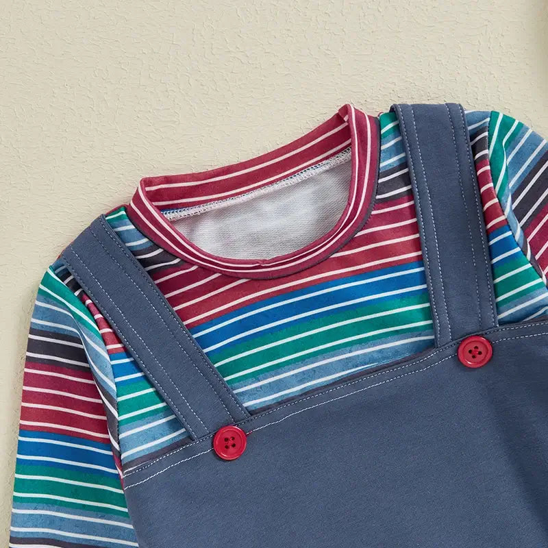 This adorable baby outfit is the perfect Halloween costume for your little one. Featuring a colorful striped long-sleeve shirt paired with a denim-look overall, this ensemble evokes the charm of a beloved, classic character. The overalls are detailed with bright red buttons, adding a playful touch to the outfit. Ideal for Halloween festivities or dress-up play, this costume will ensure your baby stands out with nostalgic flair.