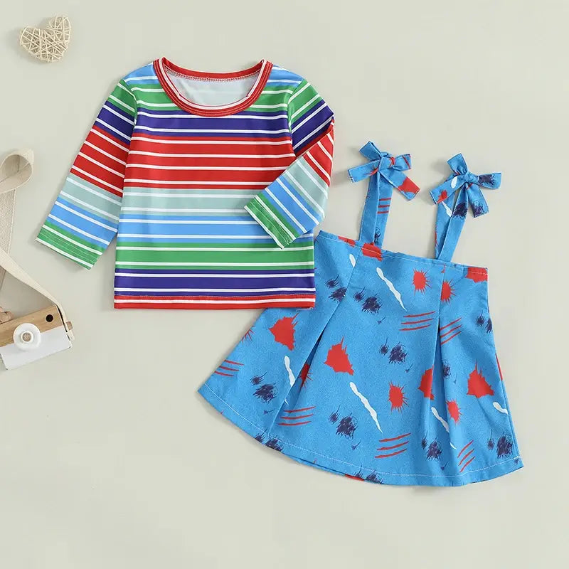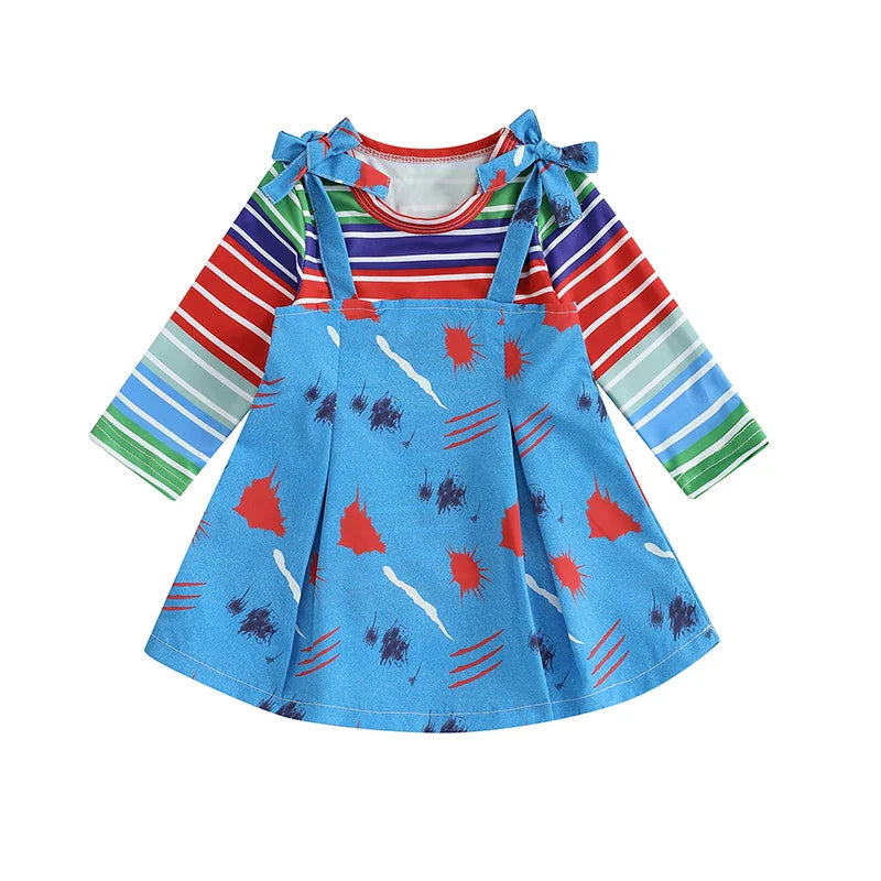 This delightful baby outfit is the perfect Halloween costume for your little one. Featuring a vibrant striped long-sleeve top paired with a blue pinafore dress adorned with playful red and blue splashes, this ensemble brings a nostalgic and fun vibe. The dress ties at the shoulders with cute bows, adding an extra touch of charm. This outfit captures the essence of a classic character, making it an ideal choice for Halloween festivities or dress-up play.