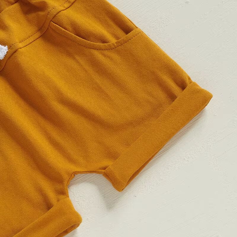 Get ready for spring adventures with this delightful little boy's set, perfect for Easter celebrations and beyond. The tee features a fun and colorful print of cars and carrots, adding a touch of whimsy and playfulness to your little one's wardrobe. Paired with vibrant mustard yellow shorts that boast a comfortable fit and a decorative white drawstring, this set is both stylish and functional. This charming ensemble is sure to be a hit, making it a fantastic choice for springtime outings and family photos.