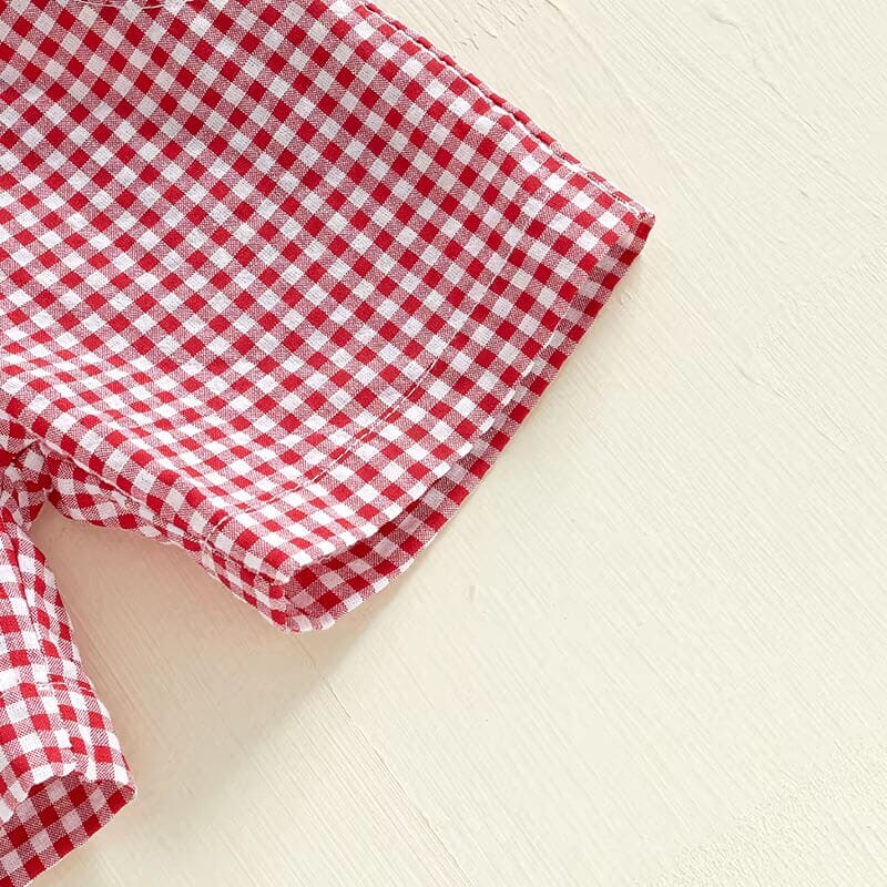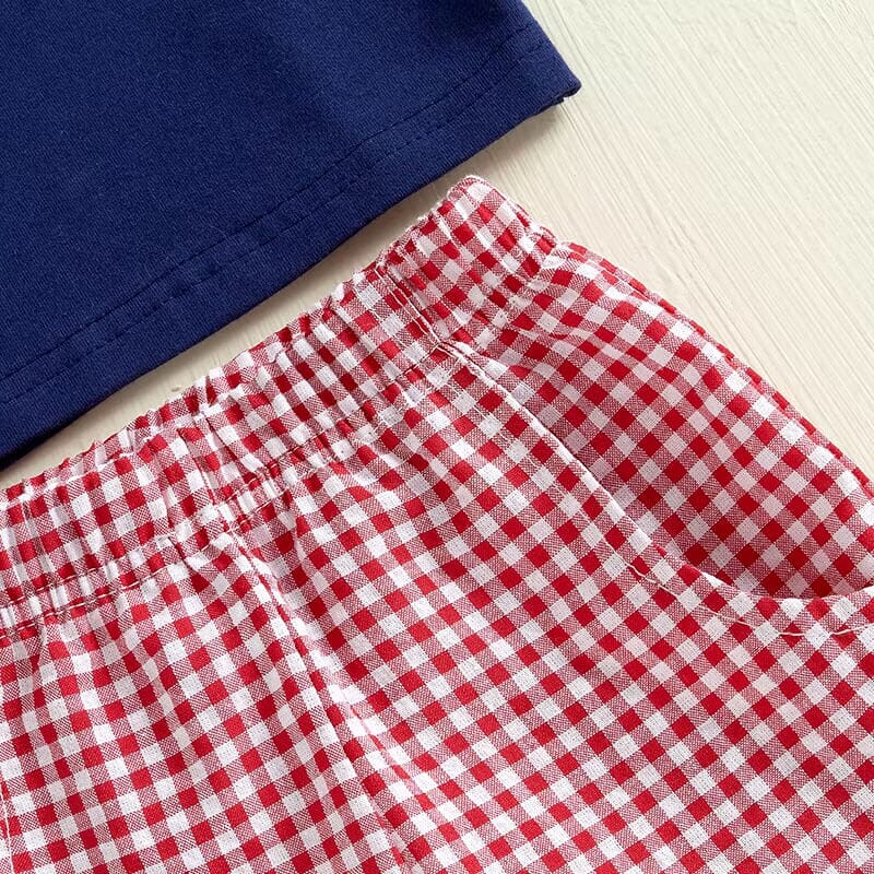 Chug into charming style with our playful toddler boy set, featuring a deep navy tee embellished with a bright red and white checkered fire truck appliqué. This eye-catching top is paired with matching checkered shorts, crafting a look that’s both vibrant and comfortable for all-day play. Perfect for casual outings or imaginative play at home, this set keeps your little hero looking cute and feeling great