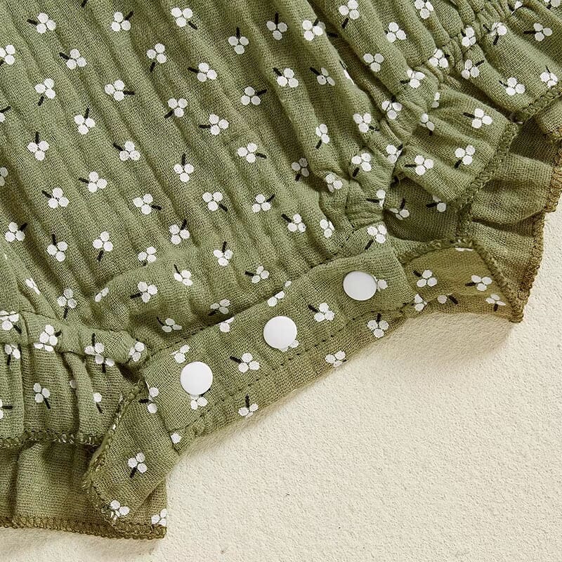 This charming baby girl romper combines comfort and timeless style with its delicate floral print. Featuring puff sleeves and a gathered waist, it offers a soft and flowy silhouette perfect for your little one. The snap closure at the bottom allows for quick and easy diaper changes, making it practical for parents. Complete with a matching bow headband, this set is a must-have for creating an effortlessly adorable look.
