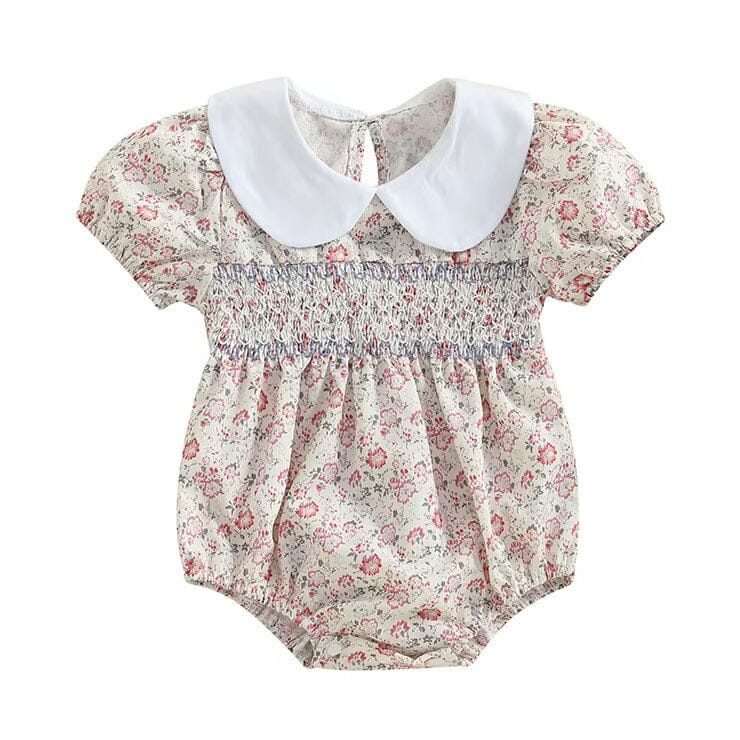 This baby girl romper is the epitome of charm and elegance, perfect for any special occasion or a casual day out. Featuring a delicate floral print and a classic Peter Pan collar, it exudes timeless style. The smocked bodice adds an adorable touch while ensuring a comfortable fit for your little one. Available in two lovely colors, this romper is a versatile addition to your baby's wardrobe for spring and beyond.