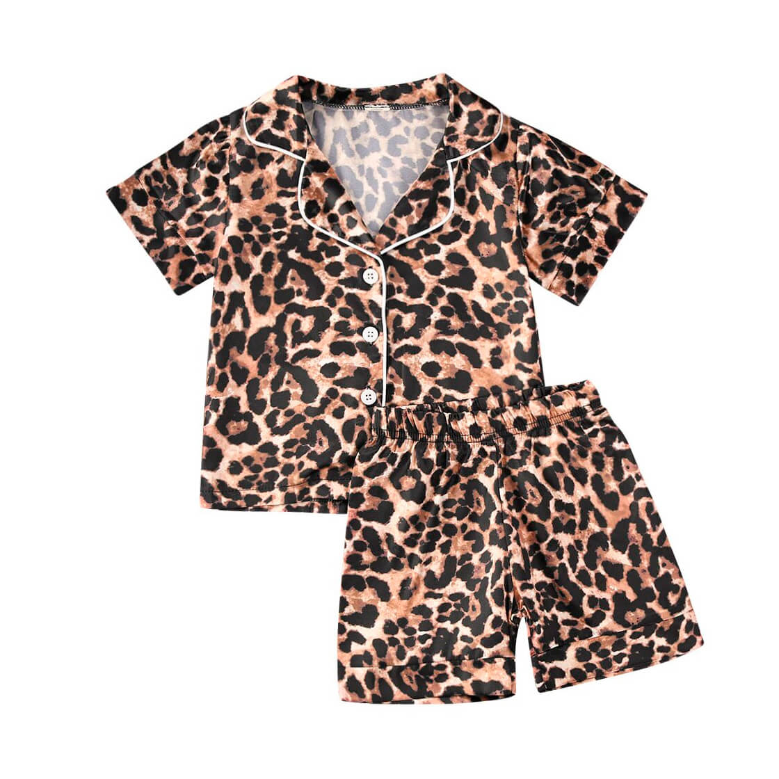 Let your little fashionista sleep in style with this adorable toddler girl pajama set. It features a short sleeve leopard shirt with a trendy collar, adding a touch of wildness to the ensemble. The matching shorts complete the set, featuring the same leopard print for a coordinated look. This pajama set is perfect for warm summer nights or lounging around the house in comfort and style.