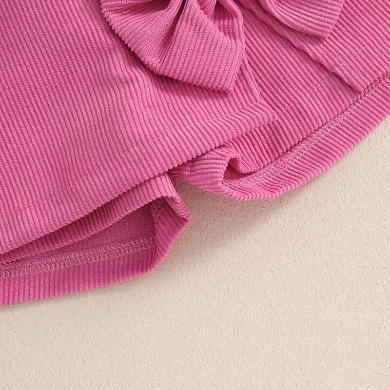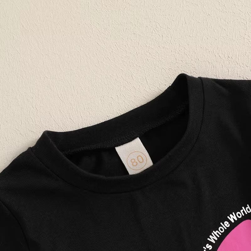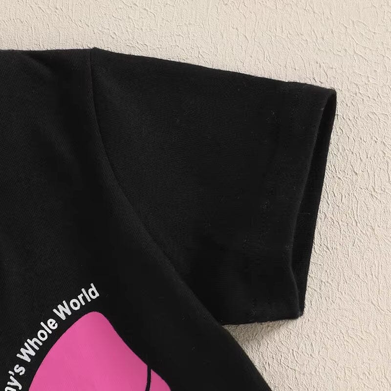 This stylish toddler girl set is the perfect combination of cute and bold, designed for little fashionistas. The black short-sleeve top features a vibrant pink bow graphic with sweet lettering that reads “Daddy’s Little Girl, Mommy’s Whole World.” Paired with textured pink shorts adorned with an adorable bow detail, this outfit is both trendy and comfortable. Whether for a casual outing or a fun photoshoot, this set is a must-have for any little girl’s wardrobe!
