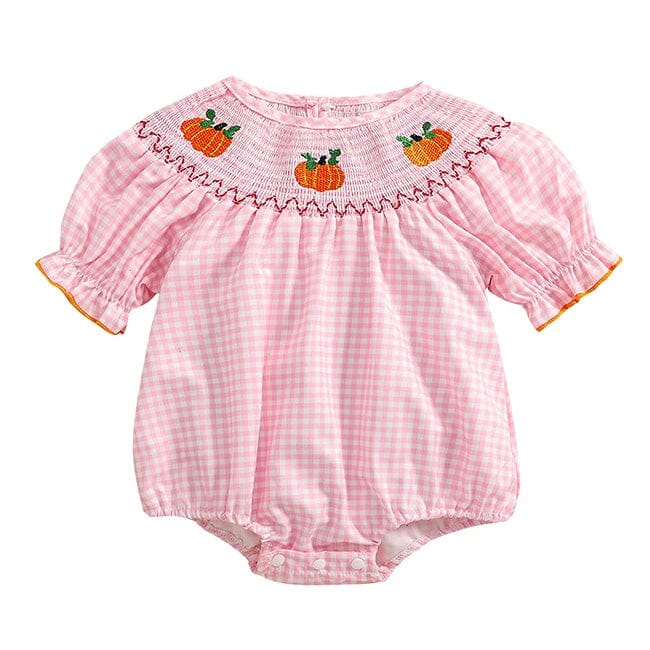Get your little one ready for Halloween with this adorable pumpkin-themed romper, perfect for festive fun. This charming romper features delicate smocked embroidery with cute pumpkin details, adding a playful touch to the classic gingham pattern. With four vibrant colors to choose from—blue, green, pink, and purple—there’s a perfect option for every little girl. Easy to wear with snap closures, this romper is as practical as it is cute, ensuring your little girl is the star of the Halloween season.