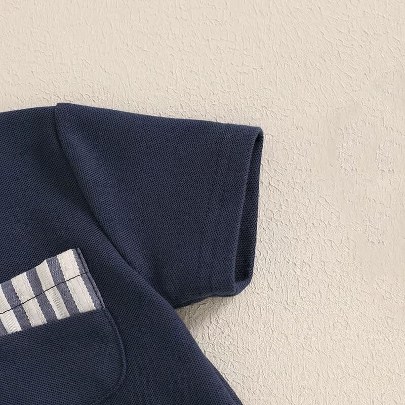 This stylish toddler boy set combines classic charm with modern comfort, making it perfect for any occasion. The navy blue polo shirt is accented with button details and a contrasting patterned pocket, adding a touch of sophistication. Paired with it are lightweight, vertically striped shorts in a neutral color palette, which provide a relaxed fit for all-day wear.