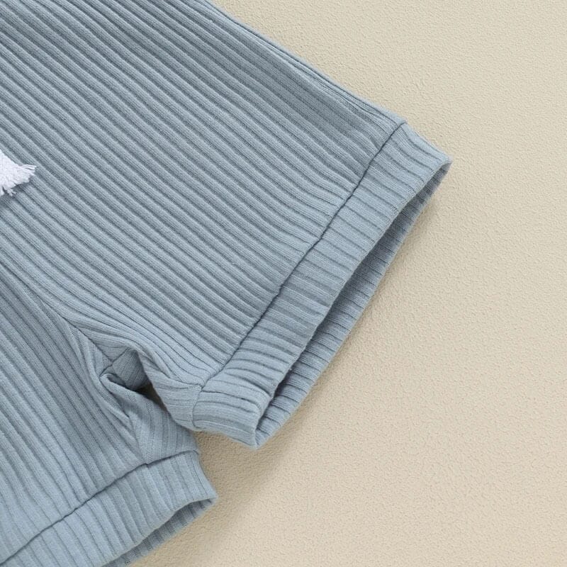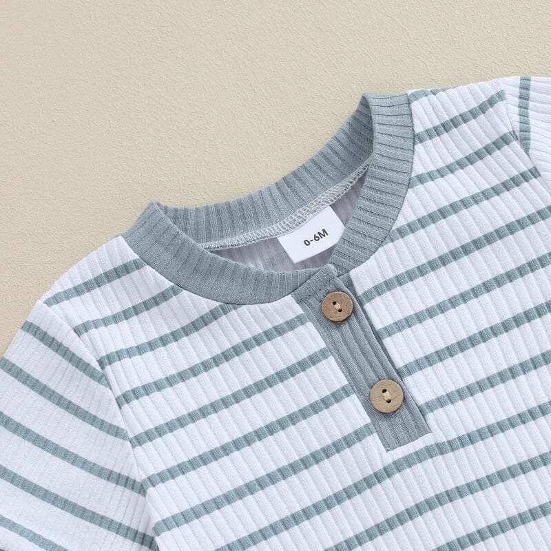 This charming little boy's set is a blend of comfort and style, featuring a classic striped bodysuit paired with cozy ribbed shorts. The bodysuit boasts a handsome henley neckline accented with wood-effect buttons, adding a touch of rustic charm. The coordinating shorts are designed with an adjustable drawstring waist for a snug and secure fit, ensuring your little one can move and play with ease. It's a versatile addition to any young adventurer's wardrobe, perfect for a day out or a comfy playdate at home.