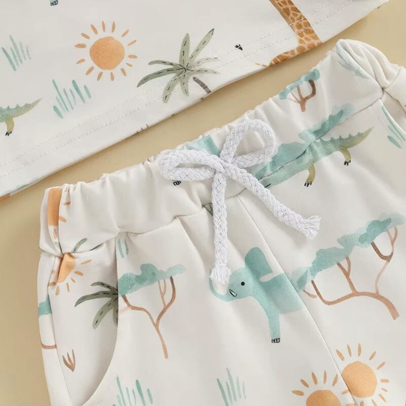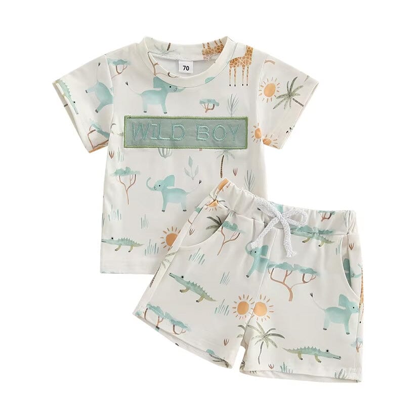 Get your little adventurer ready for fun with this adorable safari-themed boy set! The cream-colored T-shirt features playful prints of elephants, crocodiles, giraffes, and sunny landscapes, with "WILD BOY" boldly embroidered across the front. Matching shorts with an elastic waistband and drawstring ensure a comfy fit, perfect for active play or cozy lounging.