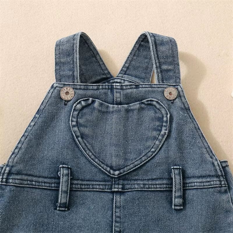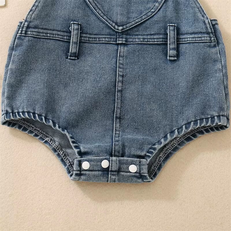 This adorable denim romper is a stylish and practical choice for your baby girl! Featuring a heart-shaped front detail, it adds a sweet touch to the classic denim design. The adjustable straps and snap-button closure at the bottom make dressing and diaper changes easy and convenient. Perfect for casual outings, photoshoots, or playtime, this versatile romper is a must-have for your little one's wardrobe!