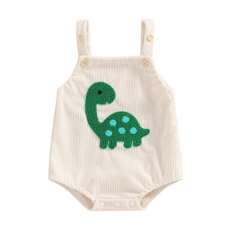 This adorable baby boy romper features a playful green dinosaur appliqué that brings a touch of whimsy to your little one's outfit. Crafted from soft, stretchy ribbed fabric, it offers comfort and flexibility, making it perfect for all-day wear. Adjustable straps with secure button closures allow for easy adjustments as your baby grows. With its charming design and practical construction, this romper is ideal for playdates, family outings, or just enjoying a day at home.