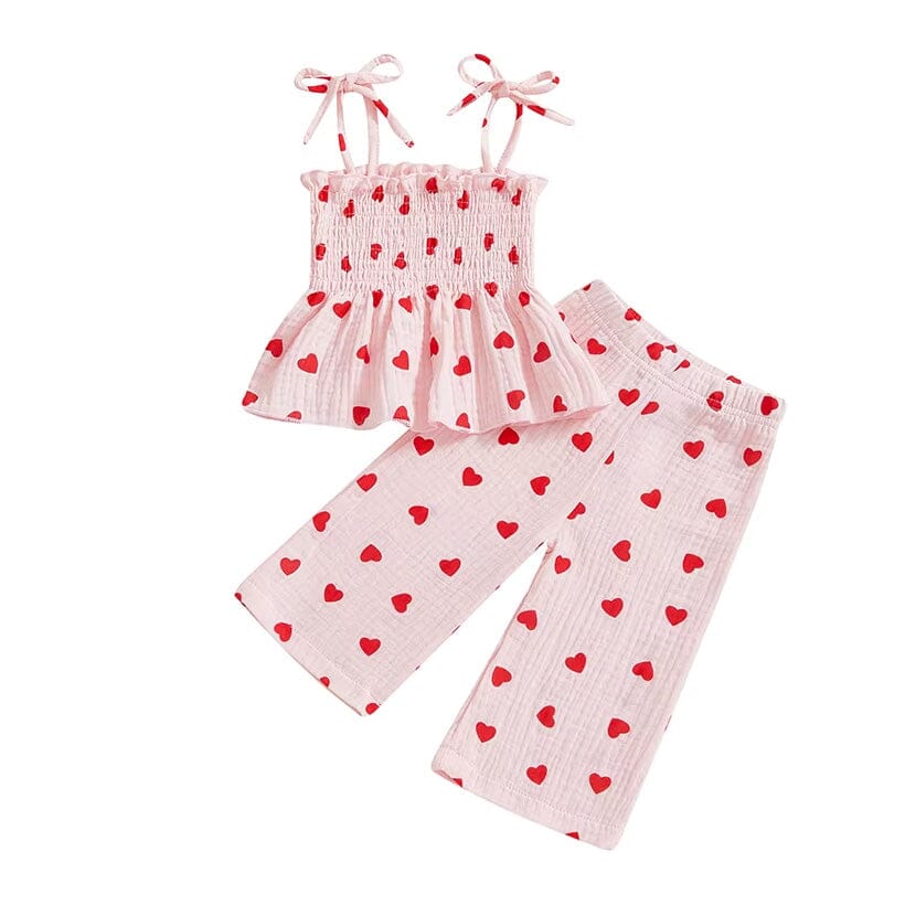 Celebrate love and style with this enchanting little girl's set, perfect for St. Valentine's Day. The outfit features a flouncy top with a charming smocked design and adjustable tie-up shoulder straps, ensuring a comfortable fit for all-day wear. Adorned with an all-over print of delicate pink hearts, it adds a playful and girly touch. The coordinating wide-leg pants are both trendy and comfortable, making it ideal for Valentine's playdates or family gatherings.