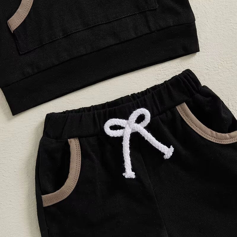 This stylish little boy set is perfect for active days and casual outings. Featuring a sleeveless hoodie and matching shorts, it combines comfort and practicality with a trendy design. With a kangaroo pocket on the hoodie and adjustable drawstrings on the shorts, it adds a functional touch to its modern look. Available in four versatile colors, this set is a great addition to any little boy's wardrobe for playtime or relaxed family gatherings.