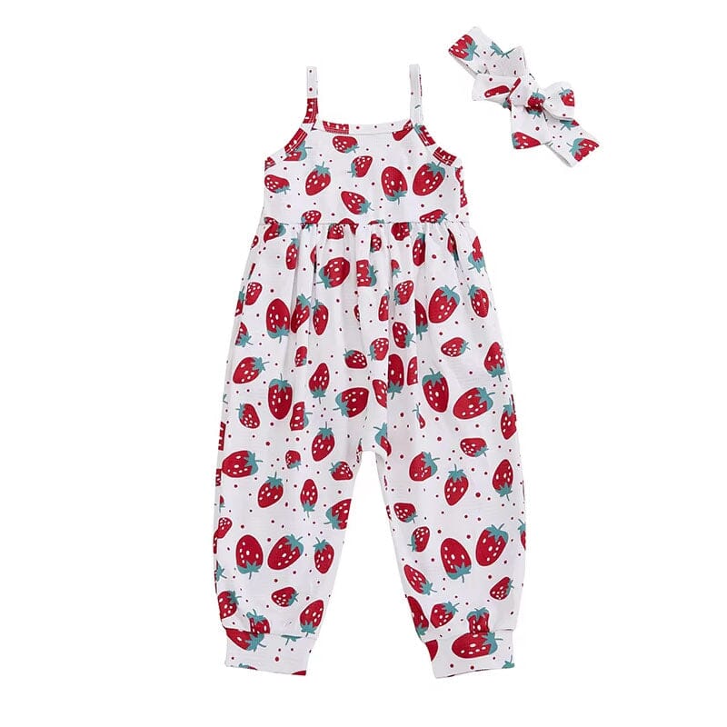Celebrate sweet simplicity with this adorable toddler girl jumpsuit, available in delightful white and pink strawberry prints. The adjustable straps make dressing quick and fuss-free, ideal for growing toddlers. Pair with matching bows for a charming ensemble that's as functional as it is cute. Perfect for a sunny day out or a family picnic, these jumpsuits add a burst of fun and color to any little one's wardrobe.