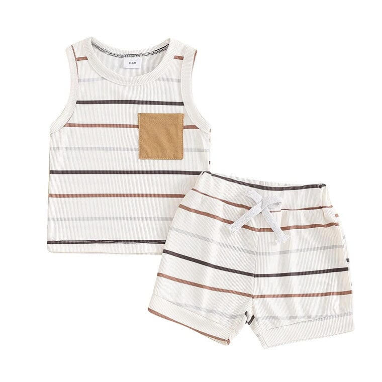 Step into summer with this stylish and comfortable baby boy's tank top and shorts set, perfect for sunny days and outdoor adventures. The set features a classic sleeveless tank top adorned with neutral-toned stripes and a contrasting tan pocket, adding a touch of sophistication to the casual look. The coordinating shorts mirror the tank's stripe pattern and are designed with an adjustable drawstring waist for a perfect, comfortable fit. It's an ideal choice for a relaxed yet fashionable summer outfit, combining both practicality and style.