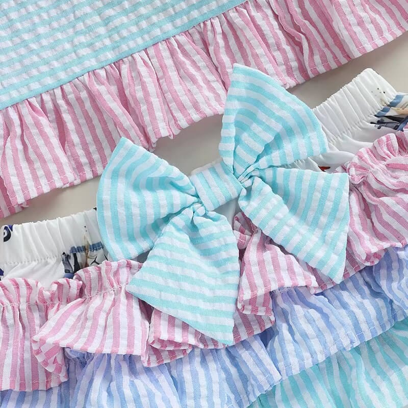 This delightful little girl’s set is perfect for sunny days and playful outings! The sleeveless top features a charming seersucker design with a golf-inspired green patch and a ruffled hem, adding a touch of fun and style. The matching ruffled bloomers boast layers of pastel-striped fabric and an adorable oversized bow at the back for a playful and feminine touch. Ideal for summer picnics, family gatherings, or photo sessions, this outfit is a must-have for your little fashionista!