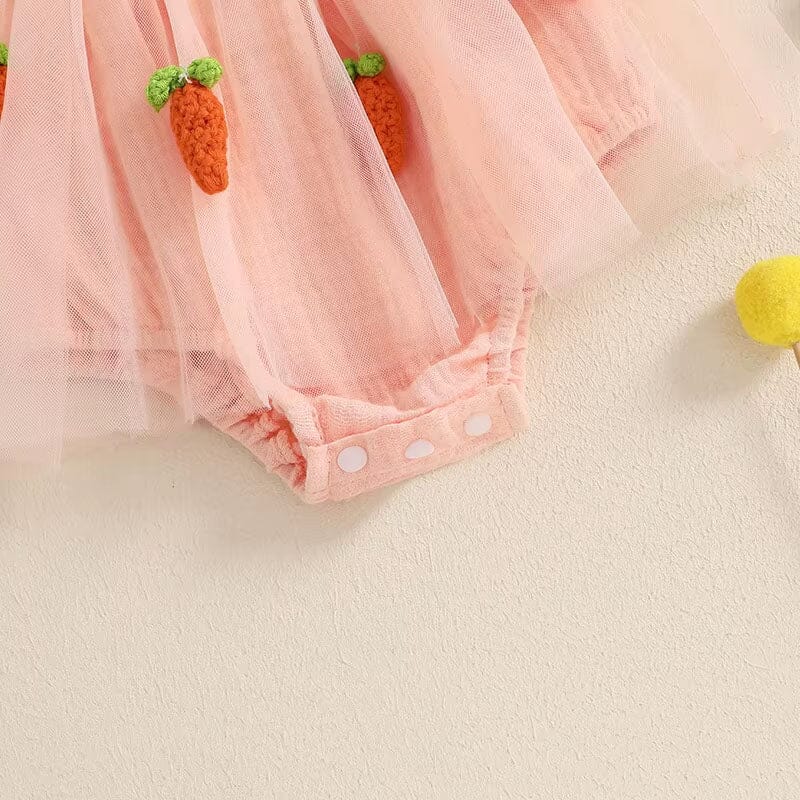 This adorable baby girl romper is the perfect choice for celebrating Easter in style. Featuring charming bunny ears embroidered on the smocked bodice and delightful 3D carrot appliques on the flowing tulle skirt, it embodies the festive spirit. Designed with adjustable tie straps for a comfortable fit, it ensures your little one feels cozy all day long. Complete with a matching headband, this set is both practical and irresistibly cute for your baby girl's Easter adventures.
