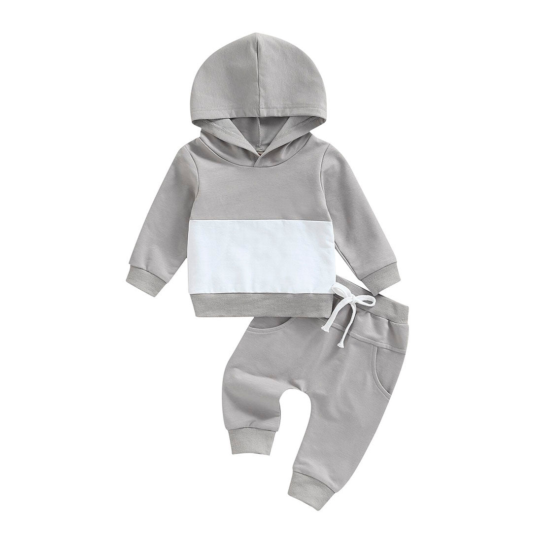 This trendy and comfortable toddler boy outfit features a stylish two-tone hoodie and solid pants. The hoodie has a contrasting color block design. The soft and breathable material of the hoodie ensures maximum comfort for your little one. The solid pants have an elastic waistband for a snug and secure fit, making it easy for your little one to move around. This adorable outfit is a must-have in your toddler boy's wardrobe.