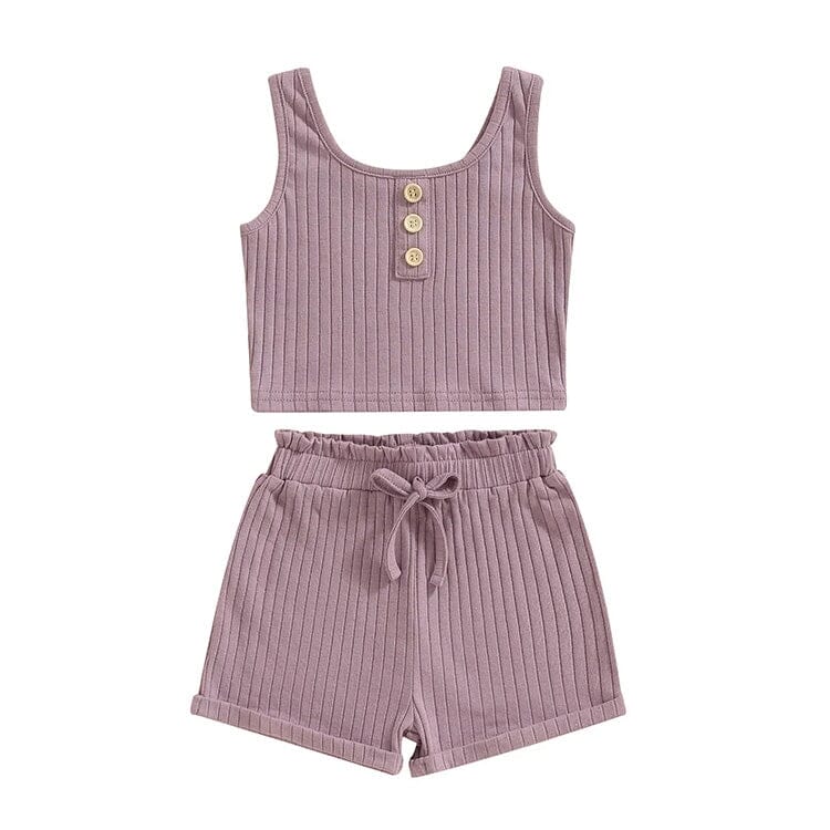 This vibrant toddler girl set is available in three beautiful colors: classic cream, playful red, and lovely lavender. Each set includes a stylish ribbed tank top with decorative buttons and coordinating shorts that feature a comfortable elastic waistband and a charming drawstring for a perfect fit. The versatile colors and simple design make these sets easy to mix and match with other wardrobe pieces. Perfect for a casual day out or just lounging around the house, they add a touch of sweetness and style to any toddler's outfit collection.