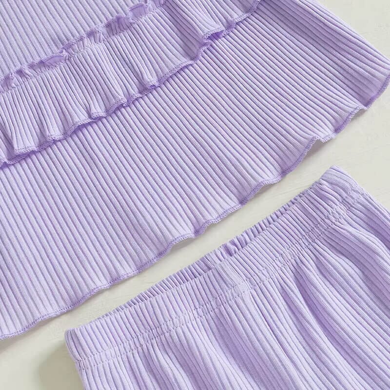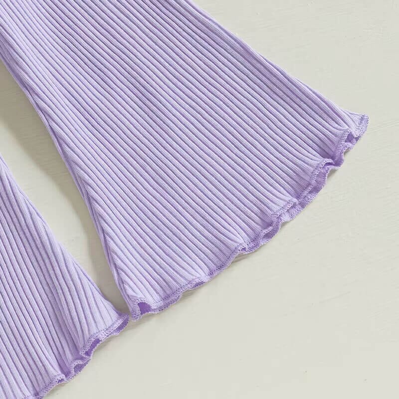 Introduce a touch of graceful style to your toddler's wardrobe with this charming three-tiered ruffle top and flared pants set, offered in three soothing colors: lilac, coral, and taupe. This set not only provides a stylish ensemble for your little one but also offers versatile mix-and-match possibilities with other casual or dressy pieces.