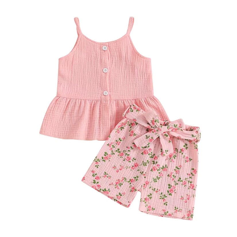 This adorable toddler girl set combines breezy comfort with a charming floral design. The lightweight top features delicate straps and button details, paired perfectly with high-waisted shorts adorned with a dainty floral pattern and a matching bow tie for an extra touch of sweetness. Perfect for family outings, picnics, or casual summer days, this outfit effortlessly blends practicality and style. Available in two beautiful color combinations, it’s a must-have addition to any toddler's wardrobe!