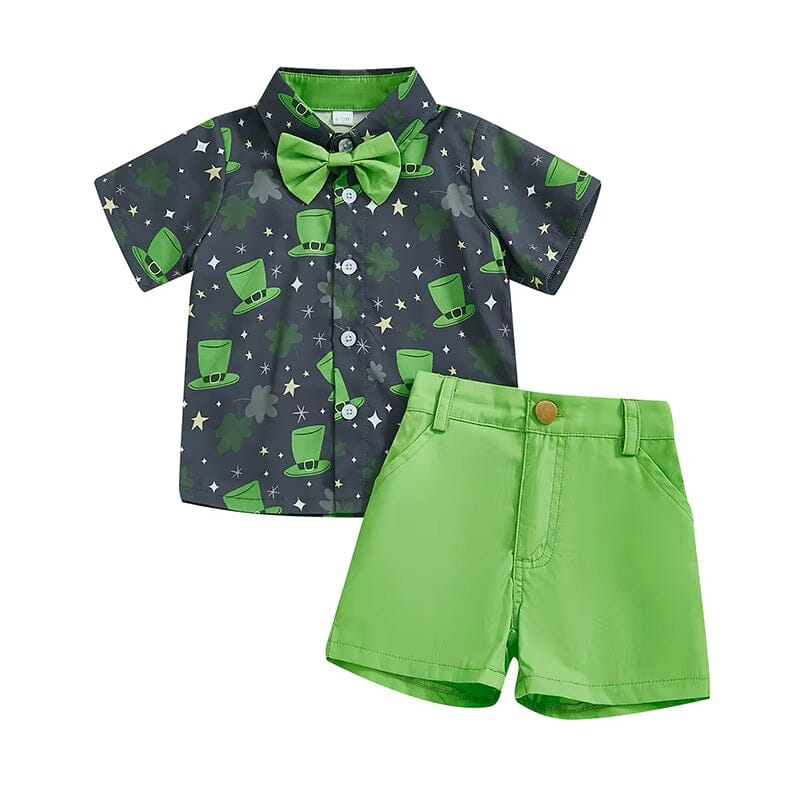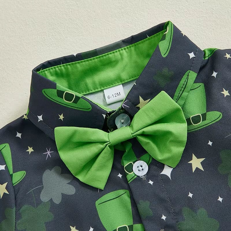 Get ready for St. Patrick's Day with this charming toddler boy set that exudes festive spirit and style. The ensemble features a dark shirt adorned with playful green hats, stars, and clovers, complemented by a bright green bow tie for an extra touch of flair. The matching green shorts are tailored for comfort with a relaxed fit, perfect for a day of parades and celebrations. It's an ideal choice for making those St. Patrick's Day photos extra special and memorable.