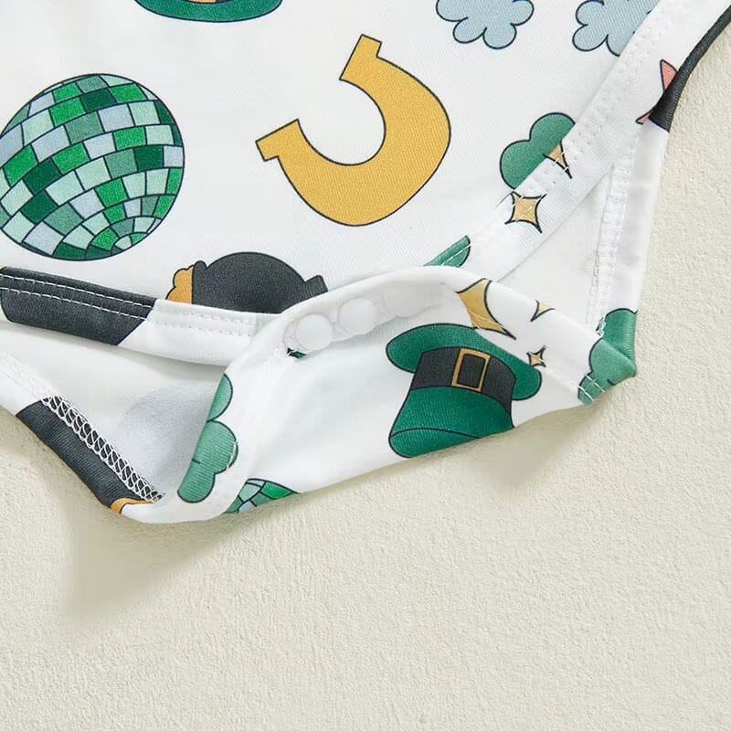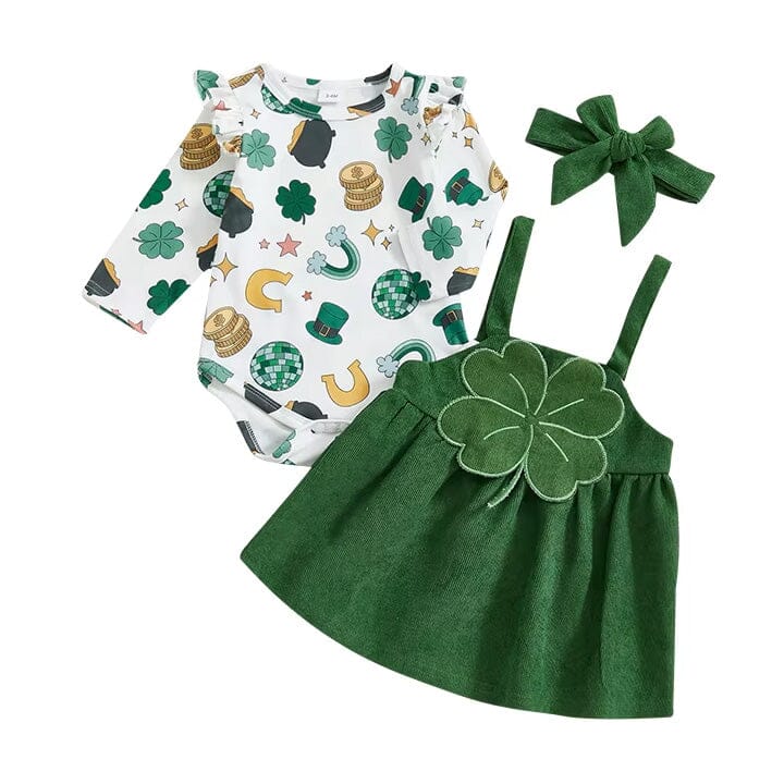 Celebrate St. Patrick's Day in style with this adorable baby girl set that captures the spirit of the holiday perfectly. This charming ensemble includes a bodysuit festooned with festive motifs like shamrocks, pots of gold, and classic Irish hats, ensuring your little one is ready for any St. Paddy's Day festivities. The set is paired with a vibrant green pinafore skirt adorned with a prominent shamrock appliqué, symbolizing good luck and Irish pride.