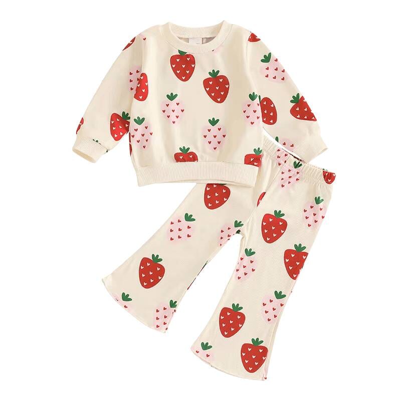 This adorable toddler outfit set features a fun and playful strawberry print, perfect for adding a pop of color to your little one’s wardrobe. The set includes a cozy long-sleeve top and matching flared pants, offering both comfort and style. With three vibrant color options to choose from, your child will love showing off their sweet strawberry-themed outfit during playtime or casual outings. Made from soft, breathable fabric, this set is perfect for all-day wear.