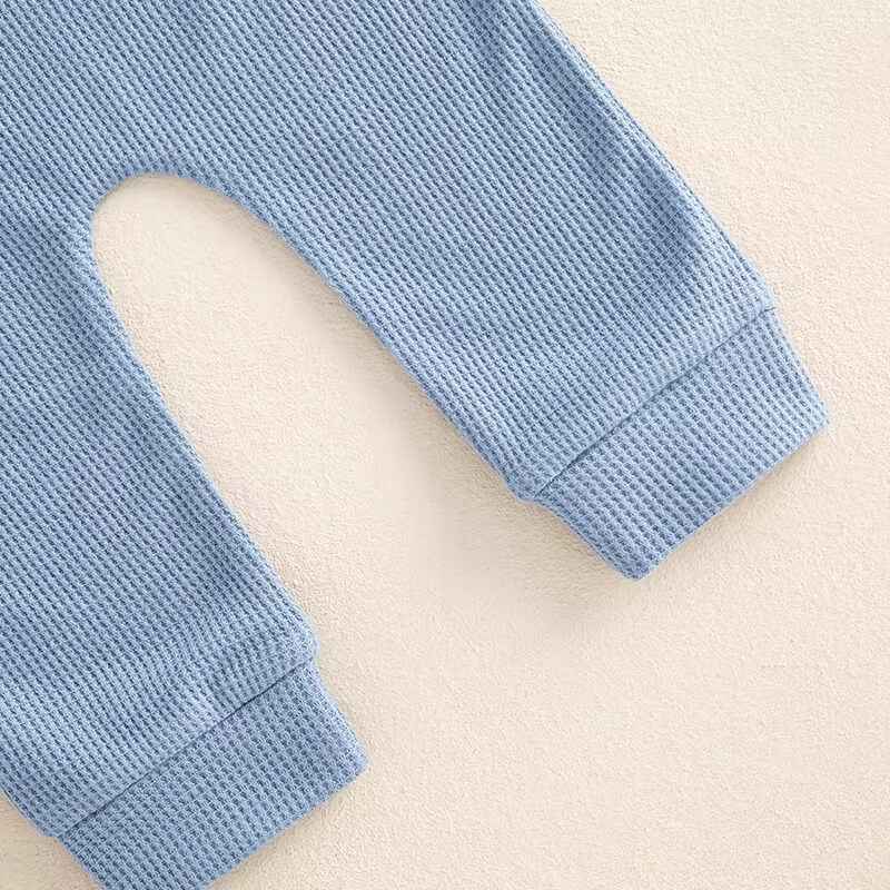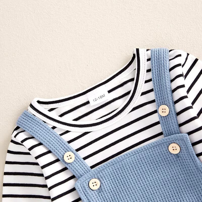 This charming toddler outfit set pairs a classic black-and-white striped long-sleeve shirt with adorable waffle-knit overalls, creating a stylish and comfortable look for your little one. The overalls feature functional buttons and a front pocket for added detail. Available in three color options—blue, mustard, and olive green—the set is perfect for playdates, casual outings, or family photos. The soft, breathable fabric ensures comfort throughout the day.