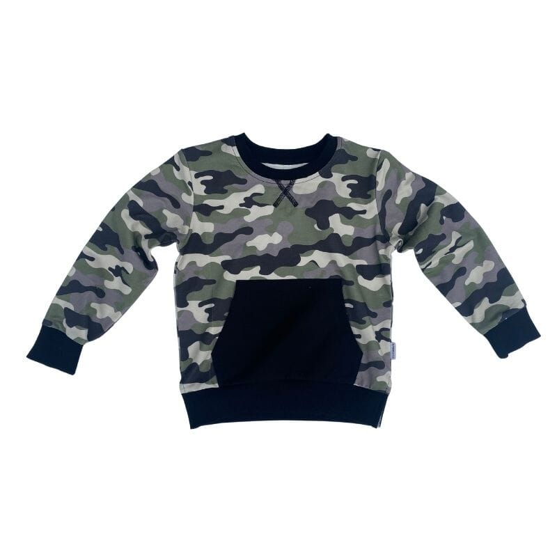Elevate your child's wardrobe with the Camo Jogger Pullover Top. This pullover features a long and narrow fit with a kangaroo front pocket and signature Sunday & Co. side tag. Made from a comfortable and flexible material and includes side slits that make it the perfect layering piece.