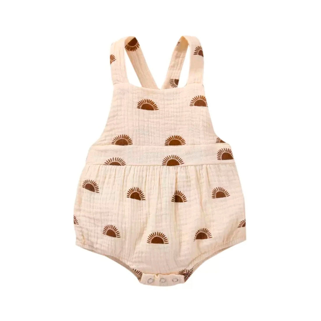 Introduce your little one to sunny days with this adorable baby girl linen romper featuring cute sunshine prints! Made from soft and breathable fabric, this romper is perfect for warmer weather. The romper features snaps at the bottom for easy diaper changes. Dress up your little sunshine in this charming onesie for any occasion!