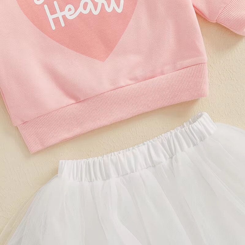 Embrace the spirit of Valentine's Day with this enchanting toddler girl set, perfect for celebrating a day filled with love. The soft pink sweatshirt, adorned with a "Sweet Heart" design, pairs beautifully with a flowing white tulle skirt, creating an outfit that's as sweet as it is stylish. This set is ideal for Valentine's Day photoshoots, parties, or just spreading love and joy.