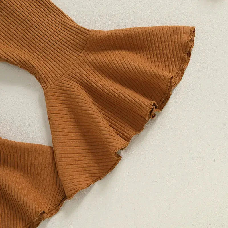 Get your little one ready for the season with this adorable baby girl outfit, featuring a cozy "Thankful Era" sweatshirt and trendy flared ribbed pants. The sweatshirt is designed with playful pumpkin graphics and a comfortable fit, perfect for keeping your child warm and stylish. Paired with ribbed flare pants in a rich brown hue, this outfit offers a fashionable yet comfortable option for your little one's wardrobe.