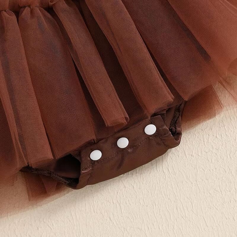 This charming baby girl costume is the perfect outfit for celebrating Thanksgiving in style. It features a delightful turkey face appliqué on a soft, beige bodice, bringing festive joy with its bright and cheerful design. The skirt is a rich brown tulle that adds a playful and voluminous touch, perfect for little ones who love to twirl. A lace trim at the waist provides a delicate contrast, enhancing the festive spirit of the ensemble.
