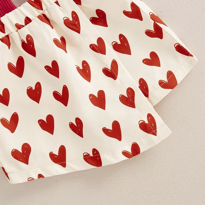 This delightful toddler girl set is a perfect choice for Valentine's Day, featuring a vibrant red ribbed turtleneck top and a contrasting cream skirt adorned with playful red hearts. The high-neck top ensures warmth and comfort during cooler February days, while the lightweight skirt adds a touch of whimsy and fun to the ensemble. Ideal for Valentine's-themed events or just a special day out, this set celebrates love with charming style.