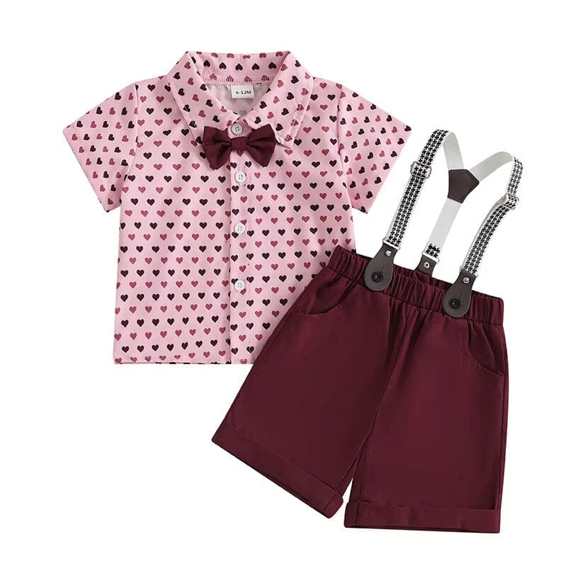 This charming little boy's set is perfect for celebrating St. Valentine's Day, featuring a delightful pink shirt adorned with tiny hearts and a matching burgundy bow tie. The ensemble includes a pair of sophisticated burgundy shorts with detachable suspenders, giving a classic touch to any festive occasion. Ideal for Valentine's Day photoshoots or family gatherings, this set blends traditional charm with a playful, loving theme.