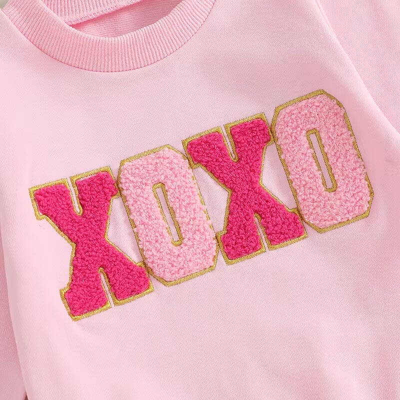 Make Valentine's Day extra special with this enchanting toddler girl set, available in two styles—classic red and soft pink. Both sets feature a cozy sweatshirt adorned with sparkling "XOXO" letters and a matching tulle skirt that adds a touch of whimsy and grace. The skirts, detailed with a shimmering silver waistband, complement the vibrant top perfectly, creating a look that's both festive and fun.