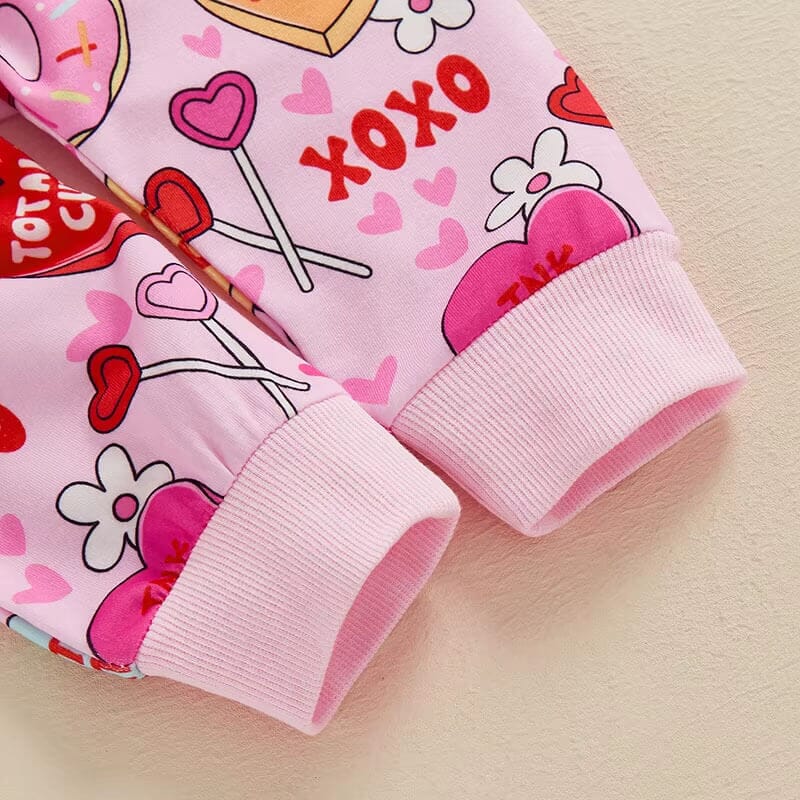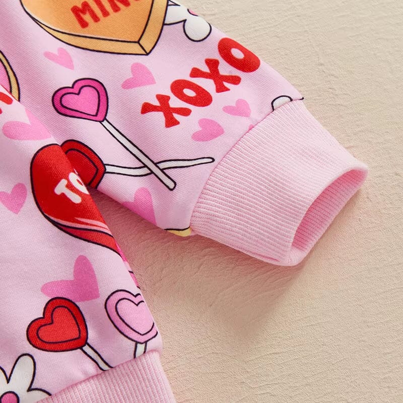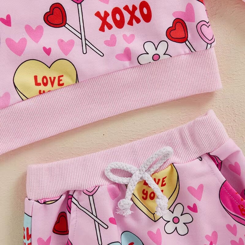 Dress your little girl in the spirit of love with this adorable set, designed to make Valentine's Day extra sweet. The set features a vibrant pink sweatshirt and matching pants, both adorned with an array of colorful hearts and playful phrases like "Be Mine" and "XOXO." This eye-catching design not only celebrates the season of love but also keeps your child cozy and comfortable with its soft fabric and relaxed fit.