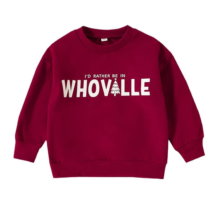 This cozy Christmas sweatshirt set comes in two festive colors, classic red and deep forest green, perfect for holiday cheer. The red sweatshirt reads "I'd rather be in Whoville" in bold white letters, featuring a whimsical tree silhouette that hints at the beloved holiday tale of the Grinch. The green sweatshirt celebrates "Whoville University" with a vintage-style emblem, giving off an Ivy League vibe with a playful twist.