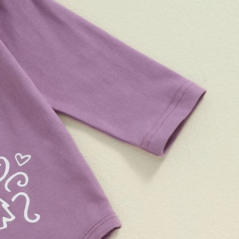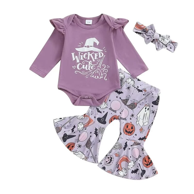 This enchanting baby girl set is ideal for her first Halloween! The long-sleeved bodysuit features a playful "Wicked Cute" slogan with adorable ruffle shoulders, adding a touch of whimsy. Paired with matching flared pants adorned with a festive pattern of pumpkins, ghosts, and witches, this outfit is perfect for Halloween parties or trick-or-treating. Made from soft, comfortable fabric, it's designed to keep your baby both stylish and cozy during the Halloween festivities.